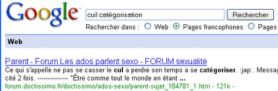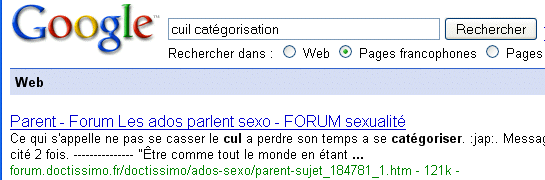Et si vous pensez que Google est pertinent, regardez plutôt la requête cuil catégorisation. Voyez ce que Google trouve avec des notices comprenant cul et catégoriser. Au rythme où Google se dégrade, il ne sera pas difficile de le supplanter d'ici à quelques années. Saura-t-il garder son capital de sympathie ?